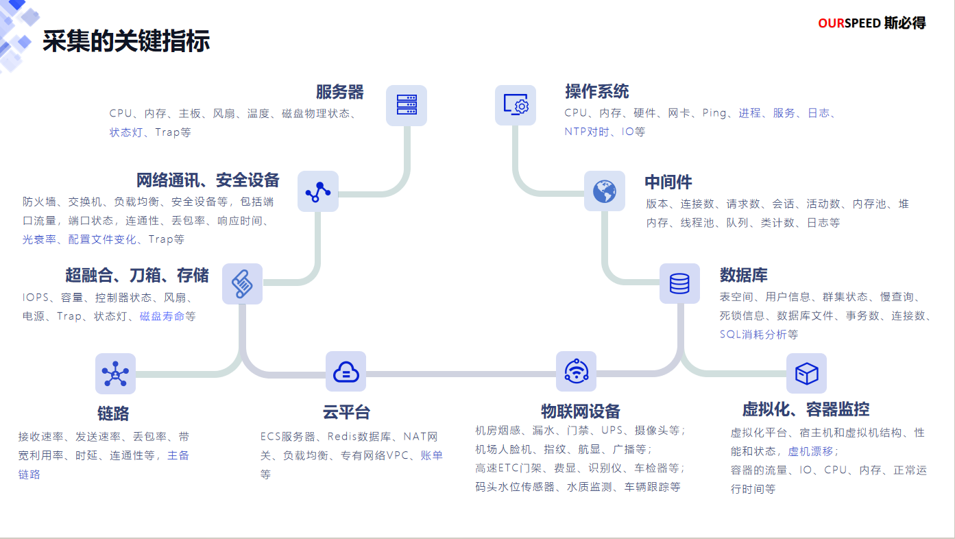 为更好的适应高速业务发展,提高日常运维效率, 提供从IT基础硬件设施、主机系统、小型机系统、网络设备、机房环境、虚拟化、中间件、数据库、摄像头到业务可用性拨测的全链路一站式故障预警监控、性能指标和管理平台,能全面、快速、有效的反应当前IT基础架构和业务系统的健康状态,进一步降低业务宕机风险,保障各业务支撑系统可靠、稳定、高效地运行,进一步提高用户的满意度和忠诚度,全面提升服务质量。