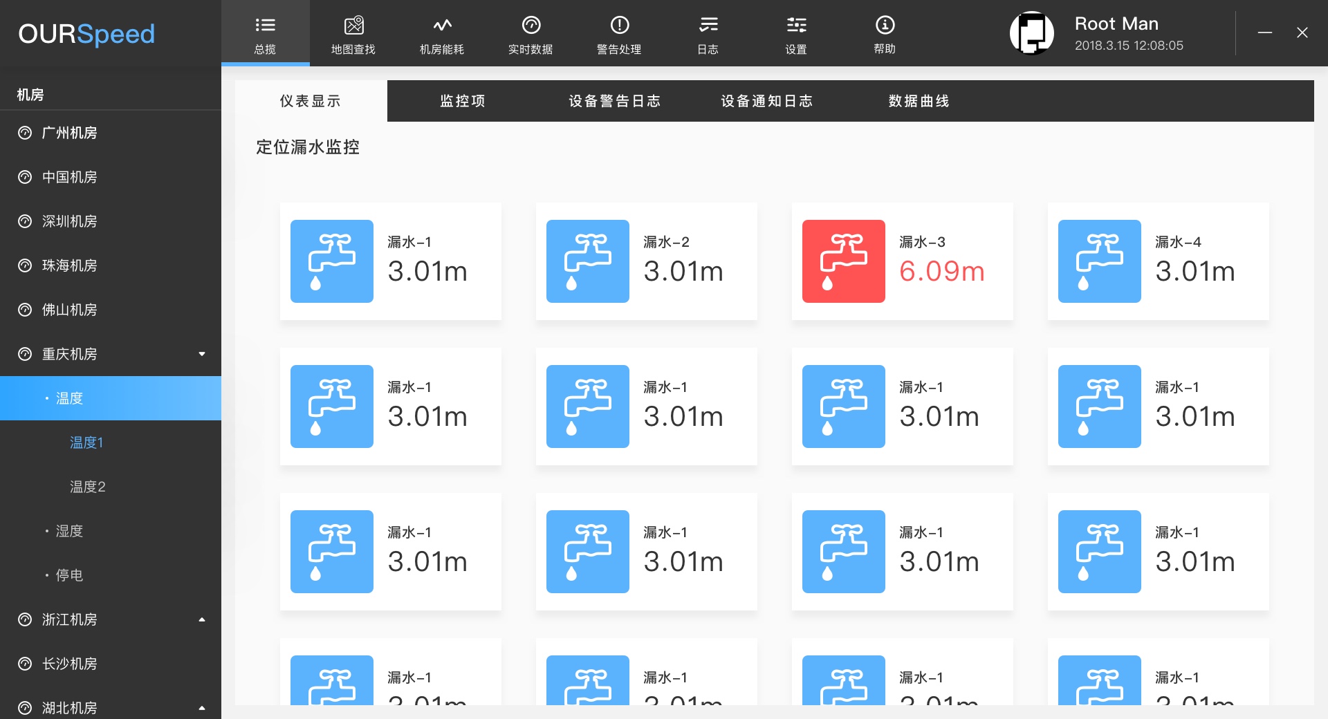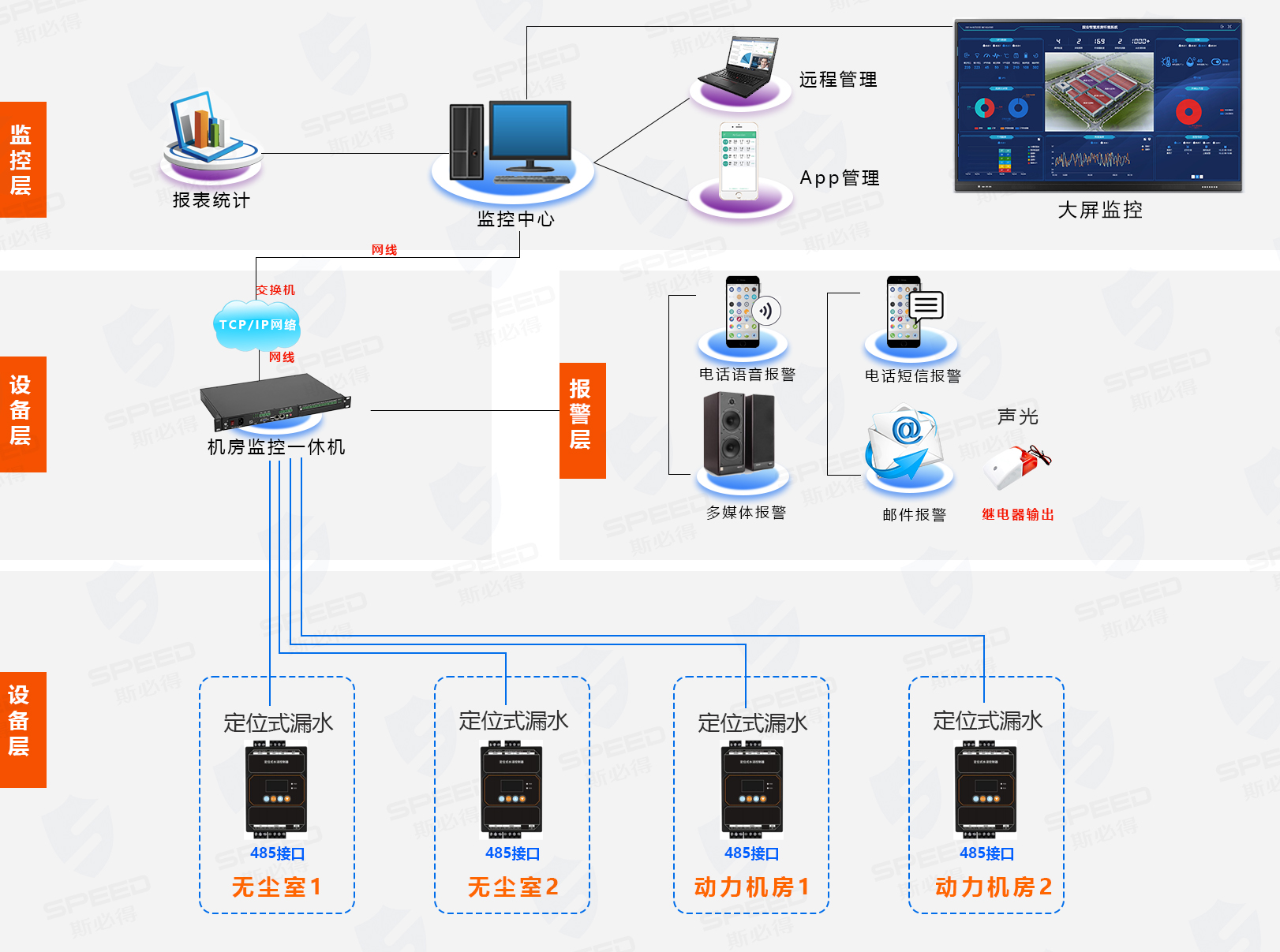 由于南方天气雨水较多,导致部分机房及重点区域出现水浸现象,导致部分设备损坏,影响公司的正常运营,因此要求对于现有的东莞分公司所涉及的动力机房以及无尘室要求增加漏水监控管理功能,且必须要能定位到区域,可远程实时监控情况,漏水报警功能要求有电话、短信、APP等。