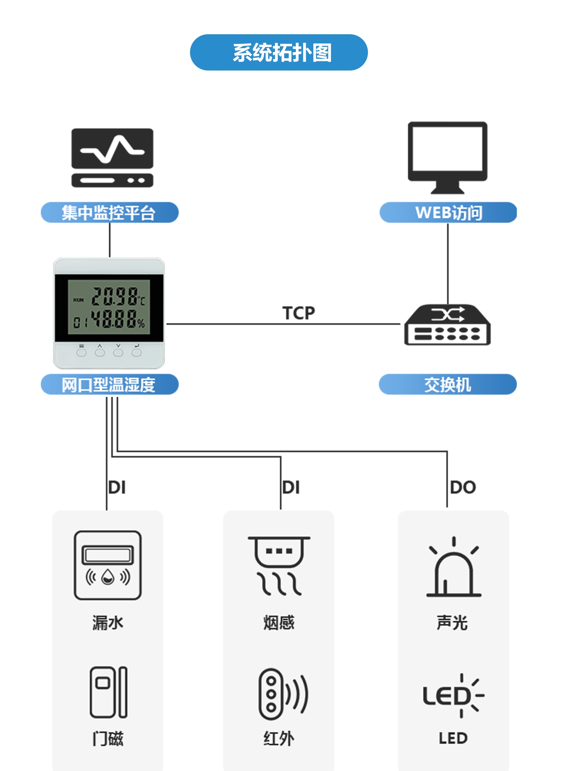 SPD-TH-RJ45网络型温湿度控制器可以用于实现多点监测、混合组网、和上位机系统通讯,该产品广泛应用于工业现场、养殖场、种植场、办公室、超市、档案室、生产车间、仓库、机房、自动控制、医疗等要求温湿度测量的场合,其高稳定性、适用性以及高性价比是产品首选,且可匹配烟感、水浸、供配电等传感器,接入动力环控监控系统中,实现更智能化的管理。