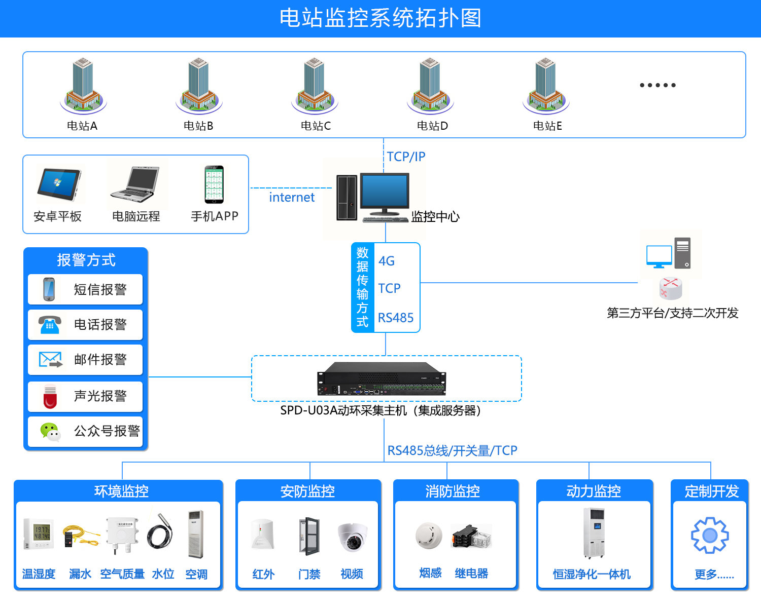 所要求的的解决方案应接入电站的动力环境监测系统,电脑软件监控,选配APP、电话、微信、小程序、现场声光、短信语音等告警方式。在多个分布在不同需要检测漏水的区域中,可通过 485 布线的方式连接至动力环境监控主机,将数据传输至环境监控平台,在监控的区域内出现漏水状况,系统会将漏水的信息通过所选定的告警方式来通知管理人员,以便管理人员及时作出处理,从而避免一些意外事故的出现。
